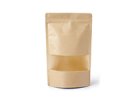 Kraft papír táskák természetes barna színűek, kisebb ablakkal, lapos aljjal és elegáns lekerekített sarkokkal.